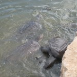 Signs posted in various locations forbid feeding the turtles and fishing in the stream. When I  visited the site recently, numerous people could be seen feeding parts of their picnic lunch to the large reptiles.