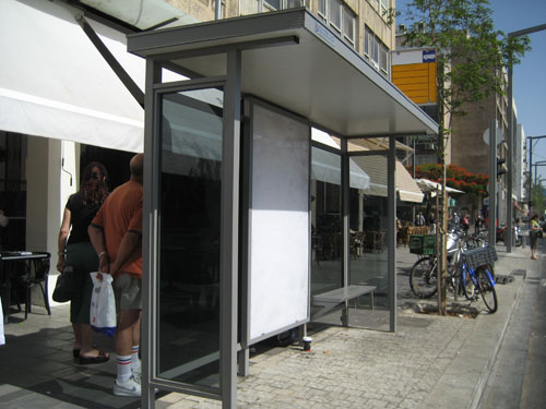 Said Leemor Chandally, who sent us these photos, “I was passing by Rabin Square, when I noticed this situation and had to laugh. A bunch of people were waiting for a bus, but nobody was waiting inside the bus stop, which was obviously brand new. Instead, everyone was crouching behind it, trying to stay in the shade.”