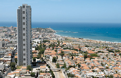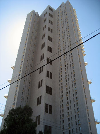 The first of these skyscrapers to appear along Derech Yaffo was the Neve Tzedek Tower (also known as Nechushtan tower, after an elevator factory that used to occupy the site). Some 180 meters in height (roughly equal to the height of Montparnasse Tower), the building was built in such a way that its facade faces the ocean, while its back (see photo at right) faces the street.