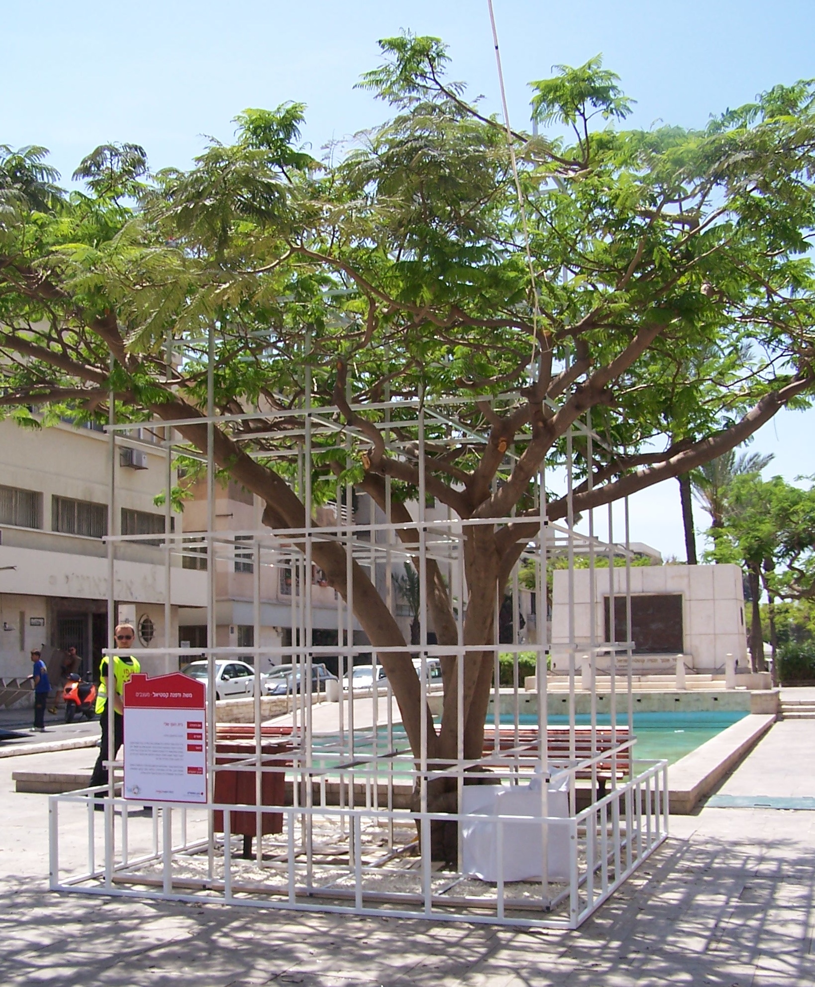 My Tree House by Moshe and Dafna Kastiel (pictured to the left) is a metal construction surrounding an existing tree on the boulevard.  In the artists’ own words, the design “emphasizes the necessary relationship between home and nature, even in the center of a city.”