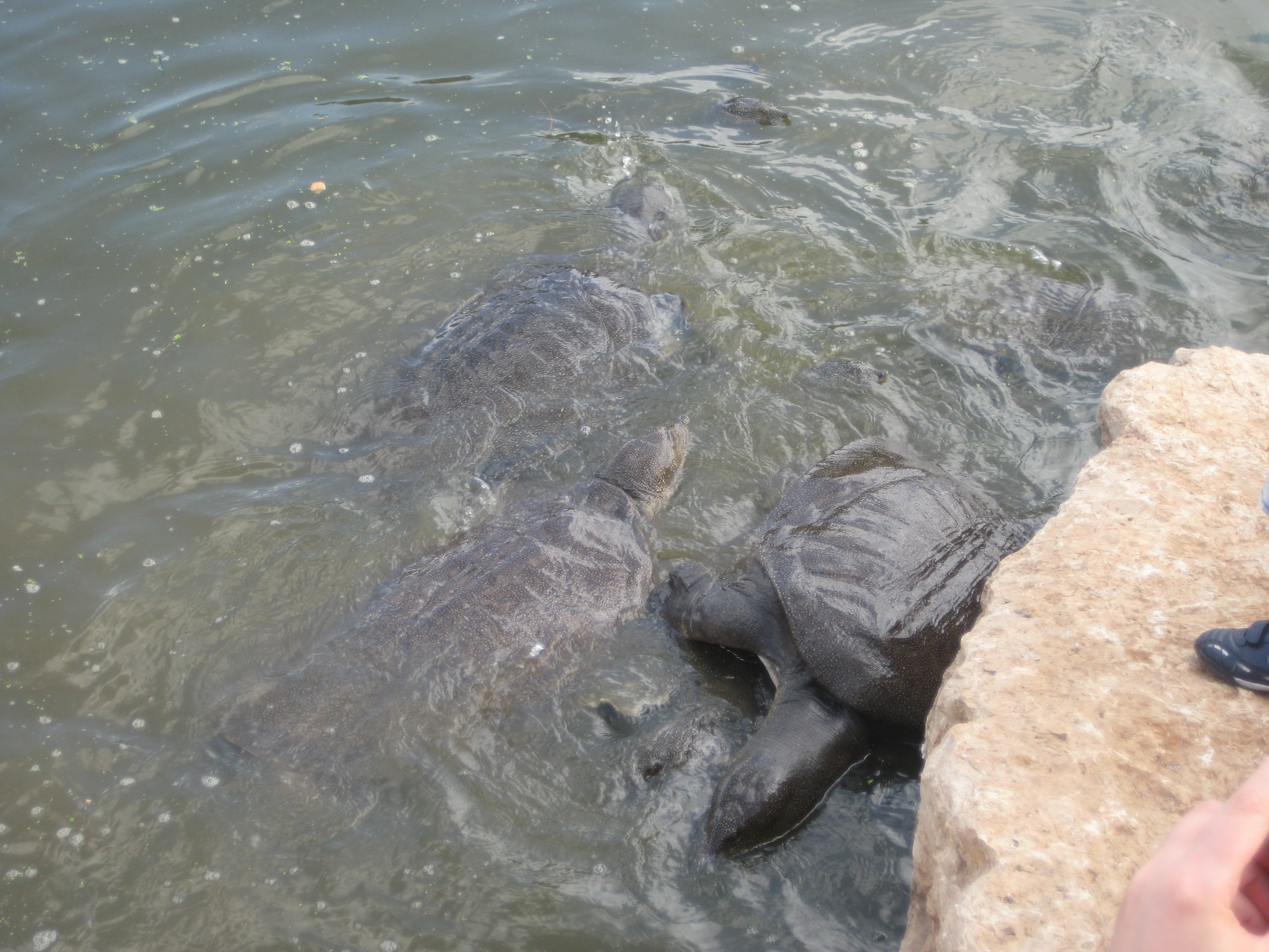 Signs posted in various locations forbid feeding the turtles and fishing in the stream. When I visited the site recently, numerous people could be seen feeding parts of their picnic lunch to the large reptiles.