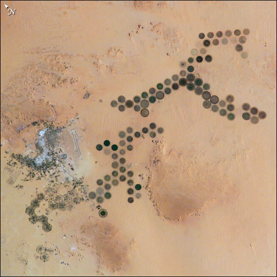 Although used in a number a number of countries, including India and desert regions of the USA, the use of this method to grow crops is so unique in Libya, that the circular pivot irrigation fields are often photographed by both orbiting satellites and NASA space shuttles passing overhead.