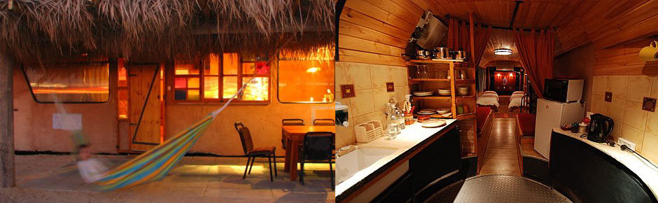 A truly distinctive experience, the zimmerbuses (or converted buses) are covered with adobe, palm leaves, and decorated with natural elements. The insides of the bus are completely changed as well by the Hirschfeld family, as you can see from the photo of one of the zimmerbuses above.