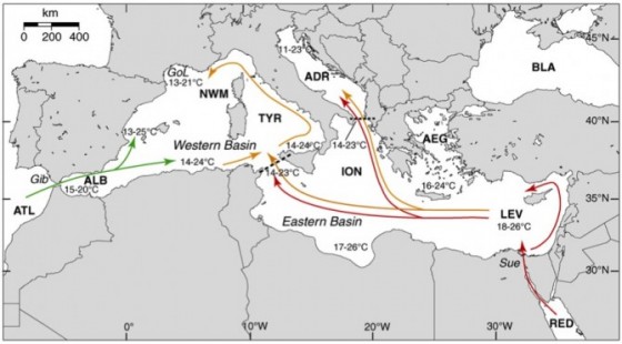 Current flows into the Mediterranean. Debris can move around a lot this way.