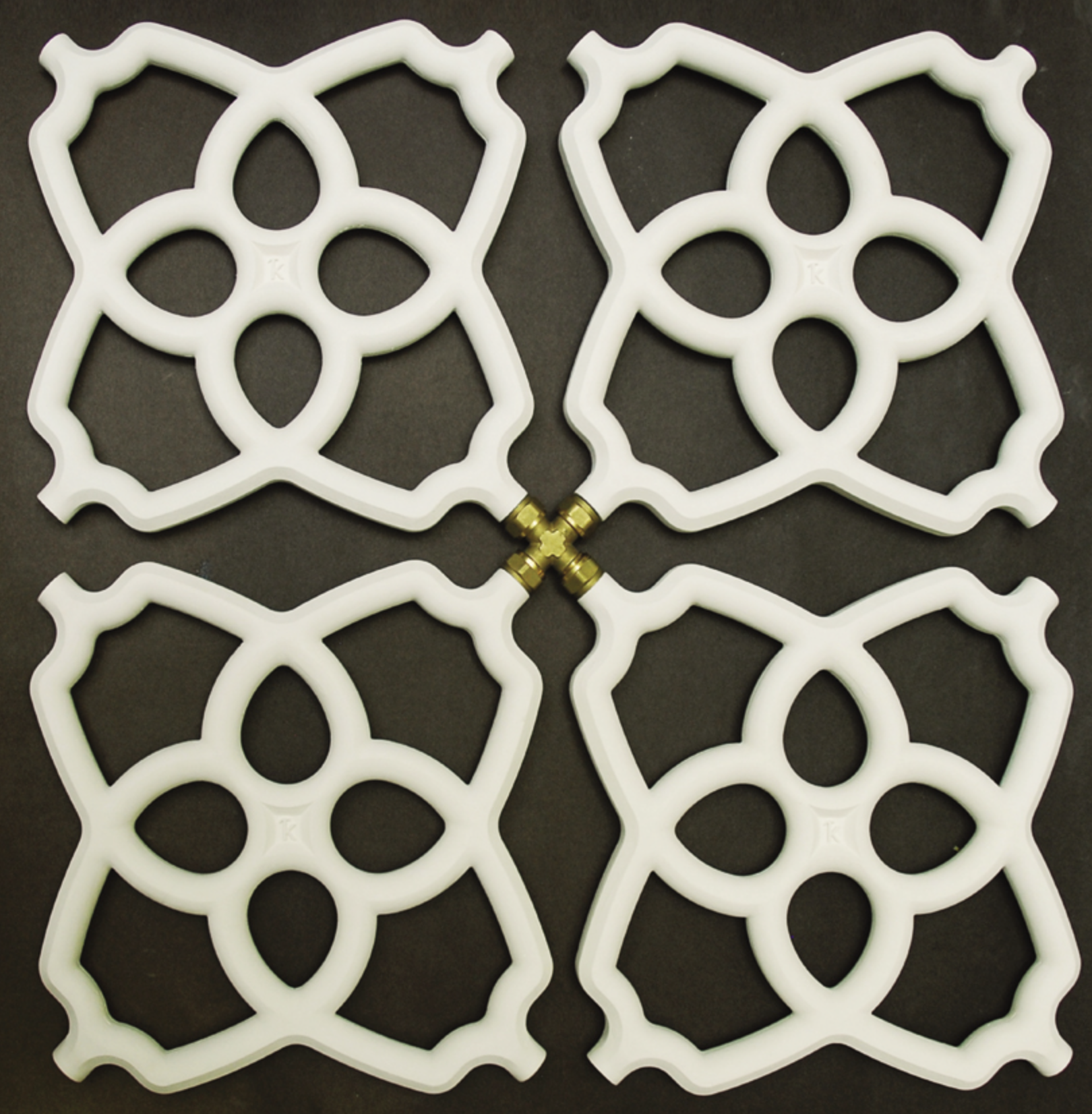 The Kahn’s combination of these two concepts culminates in water coursing through a cool network of hollow clay tiles joined together through designated connectors. Designed to connect to an almost infinite number of hand-crafted tiles, these cooling screens can fit any sized room.
