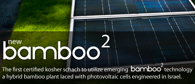 “Solar Schach” (the panels of which you can see in the photo above) is a specially engineered sukkah covering made out of the multi-purpose eco material, bamboo. The particular bamboo hybrid used to make the Solar Schach, Bamboo2, contains photovoltaic cells that enable it to produce electricity.