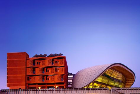 And the buildings’ facades (curved, brown, or metallic) are specifically designed to reduce heat gain. This along with small spaces, light-colored flooring, wind corridors, and a central wind tower that funnels creates the perception that the courtyard’s temperature is twenty degrees cooler than elsewhere in Abu Dhabi.