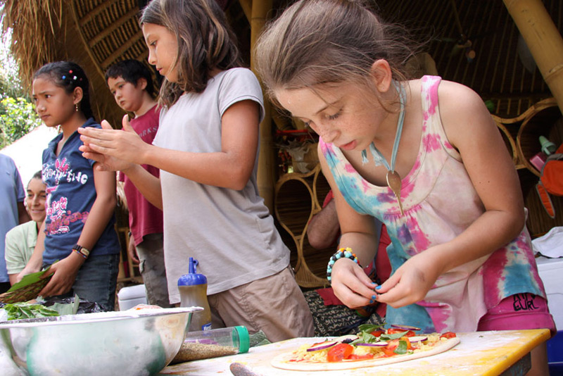 The children get their environmental studies by learning to build with bamboo. Planting, harvesting, and cooking rice, they learn where food comes from and how to grow it. They study music and the plastic arts. But is it all ancient Balinese arts and cooking traditional foods…or pizza?