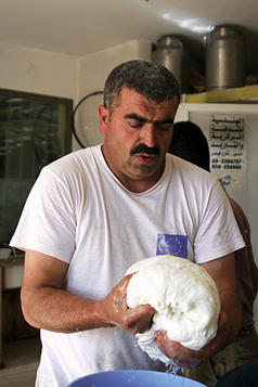 The Golden Sheep dairy produces a dazzling array of gourmet Italian cheeses from Tubas in the West Bank, including pecorino, scamorza, and ricotta. On the day that Daniella visited, Mr. Kemal Daher and Abu Sultan Zakzuk were “churning” out blobs of mozzarella cheese.