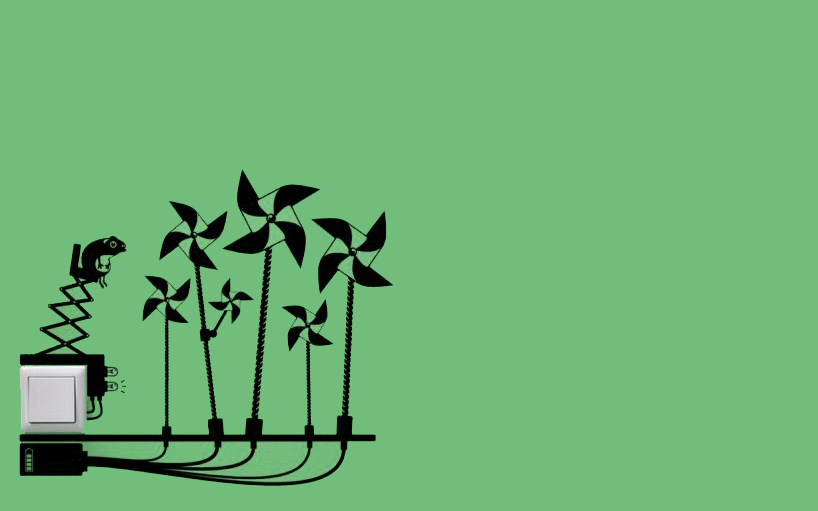 The sticker on the left represents three windmills, and on the right, a graphic depiction of water power.