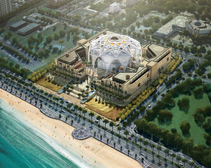 Planned for the newly cleaned up Corniche astride the Persian Gulf, the new building is a circle within a square. The 100m dome fans out in the shape of a five-petaled flower and at night, when it is lit up, will be visible from afar (solar, LED? We hope so.)