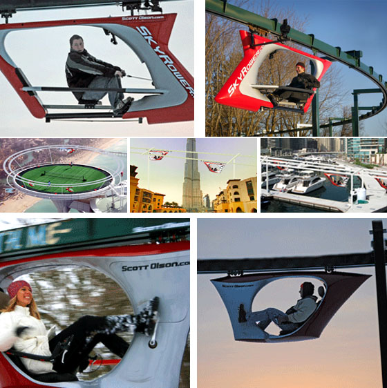 Why can’t getting around be as safe and comfortable as sitting in a car, and yet be something of a workout too? Scott Olson, the athletic Minnesota inventor of Rollerblades and the Rowbike, has come up with yet another way to do just that, and his company has a presence at the internationally attended World Future Energy Summit in Abu Dhabi this week to promote the idea and help ween the UAE off fossil fuels with his SkyRide Technology. His SkyRower and SkyRide Technology allow you to safely propel yourself through the sky, at up to ten miles an hour, suspended under a monorail.