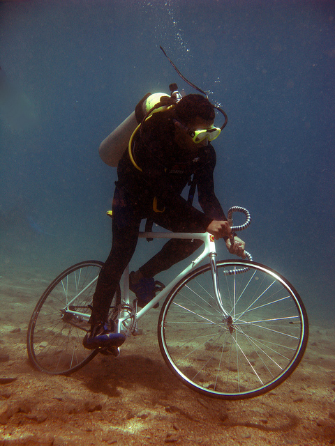 As the images show, Yasser donned his normal diving equipment, along with his fancy biking shoes, and took an underwater spin. There’s no discussion about the consequence to the bike being exposed to the Red Sea’s saltwater.