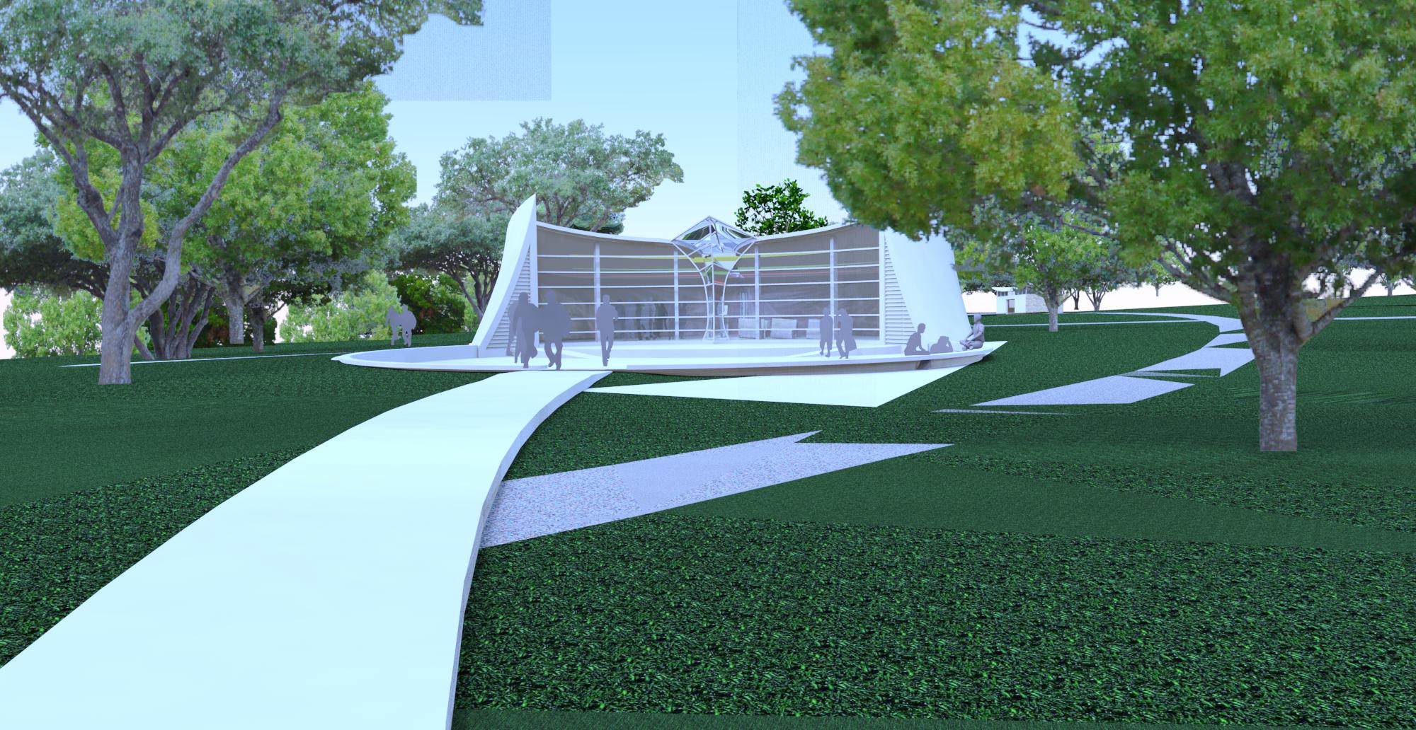 The building comprises two intersecting circles, a design inspired by sacred geometrical principles. (Called the Vesica Pisces, this intersection of circles is found in many medieval structures.) The space inside balances the space outside, creating a fluidity that blends with the natural surroundings.