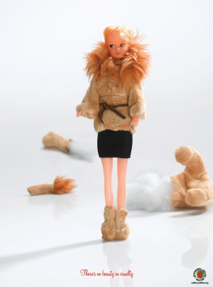 According to infurmation, 50 million animals are killed each year for the fashion industry. The print campaign, which is designed to draw attention to the cruelty associated with fur clothing, depicts dolls wearing fur and animal parts strewn in the background. Although it does not evoke a visceral objection to the practice, it is nonetheless an interesting approach.