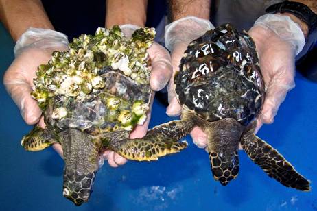 These sick baby turtles covered in barnacles are two of many turtles received for treatment in Dubai.