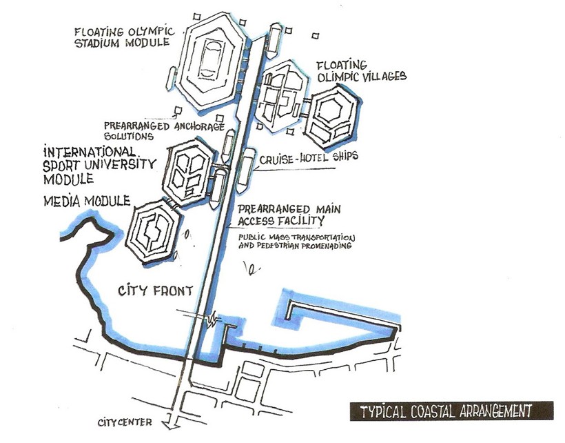 The design calls for a stadium that can hold 150,000 spectators, as well as “modules” that would contain auxiliary sporting facilities, housing accommodations, and offices. The separate modules would be towed in as needed. Once in place, the facilities would form a sturdy archipelago accessible by footbridges. Spectators and athletes could enter from a fixed pier, a pontoon bridge, a ferry, or some combination.