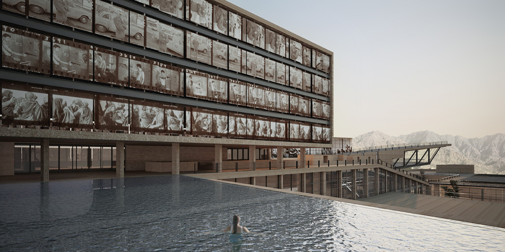 The surrounding rock creates the element of mystique, the oases are “light wells,” while the institute’s pools reflect the sky above – all in order to keep the students’ eyes and ears from glossing over the desert landscape. In other words, the architecture helps the film school’s attendees see and hear in the same way they are then expected to direct film audiences through their movies.