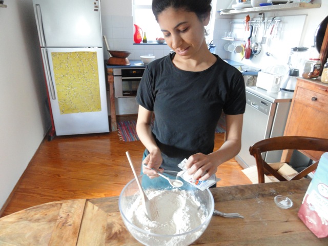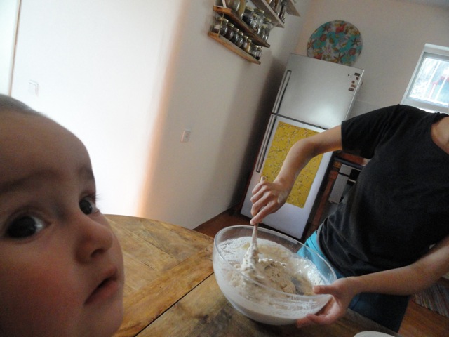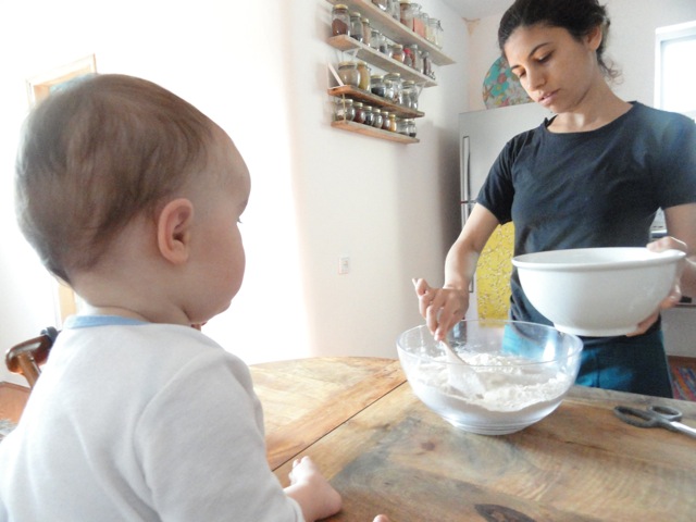 Sari has been coming over to my house a few days a week to help take care of my baby. A few weeks ago she brought a pita bread, one she’d made with her grandmother, in the old Yemenite way. “With one hand, two fingers!” her grandmother insisted. Enjoying a new health food store near my house, I picked up some high-quality, pre-sifted whole wheat flour, and some quick-rise yeast, and Sari taught me the old Yemeni ways.