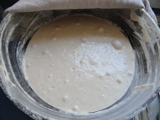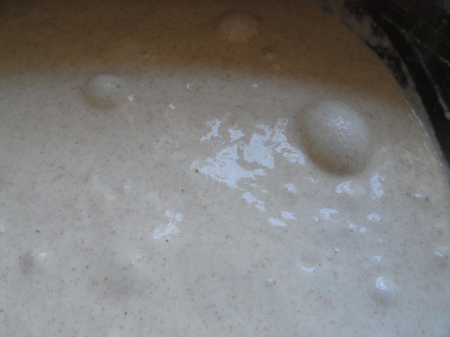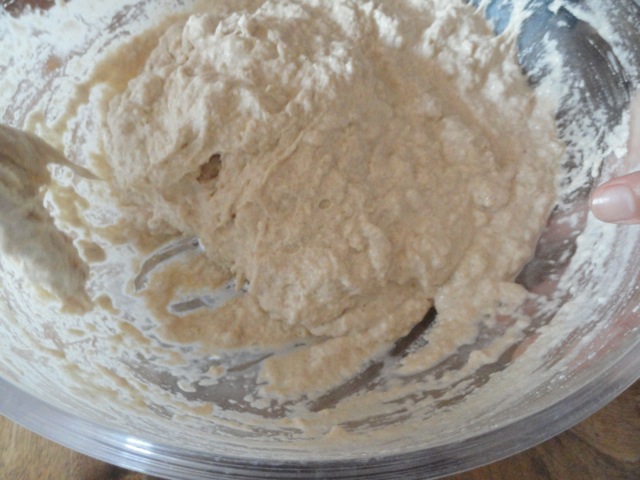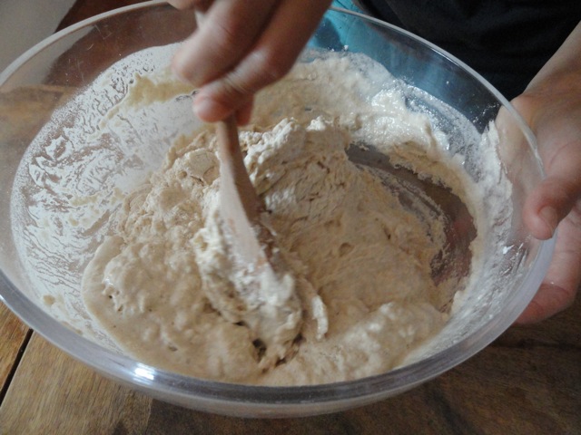 Take wooden spoon and stir while adding water. Dough should be considerably softer than when making regular bread. Firmer than cake dough, but softer than bread dough. About the consistency of cake icing or pizza dough. Later, as it’s rising you should be able to see bubbles on the surface.