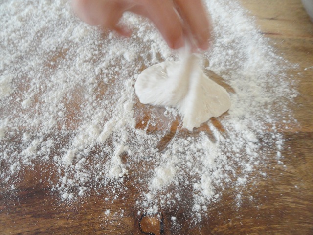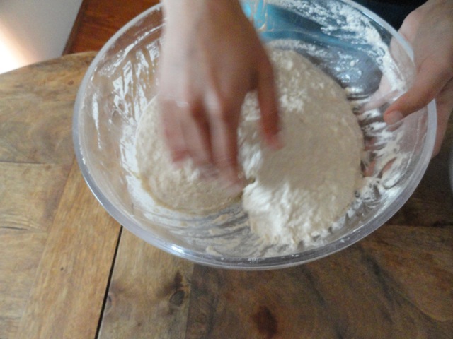 Wet fingers, and take a tangerine size ball of sticky dough and drop it onto a flour surface, preferably a tray to contain the mess. Pull wet dough from the side, and fold it up on top to form a round ball lined on the outer side with flour.