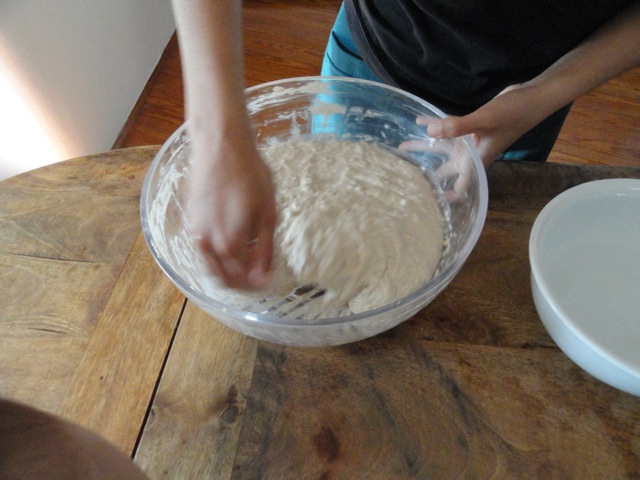 Take one hand, dip it in water, and plunge into the dough along the side of the bowl, and let the dough flop down trapping air. Repeat this for a few minutes, but only add water to prevent your hand from sticking to the dough.