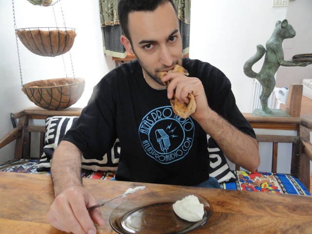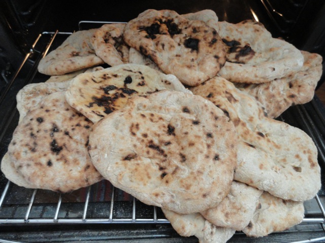 Our first round of pitas were a resounding success, and I gave a bag full to my husband’s band as they were heading for an event in Jerusalem. They are yummy eaten alone, drizzled with olive oil, or wrapped around some goat cheese. For breakfast, I commit an act of sacrilege by eating them with butter.