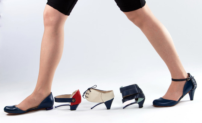 Every day you can choose one of five heel designs for a different look, without all the resources involved in creating an entirely different shoe.  The basic shoe is a flat ballet-type slipper, but modular heel attachments in different styles transform the shoe to create very different looks.