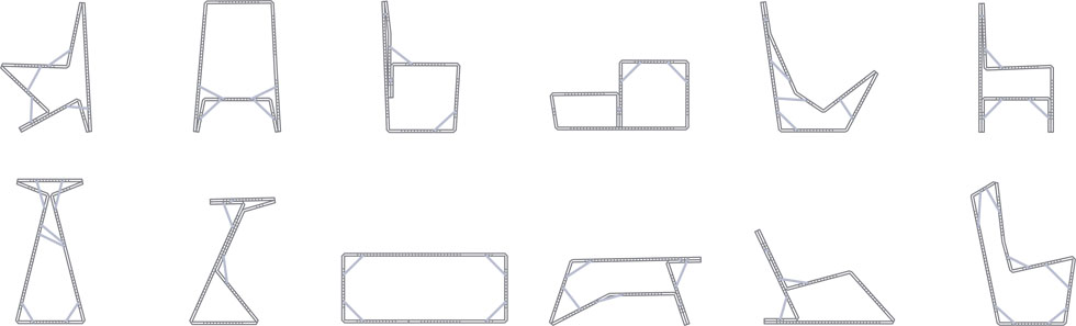 "multipurpose furniture design"The design is intended to be simple enough for anyone to modify, but also comes with an instruction booklet to help with assembling the different shapes.  A special case containing this booklet and rods that are not being used accompanies the product.