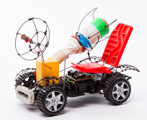 The trash is connected with metal wire to form whimsical, one-of-a-kind creations. In Sibony’s hands, plastic bottle caps, pieces of childrens’ plastic toys, remote controls and plastic tupperware turn into fantastical masks and futuristic-looking vehicles.