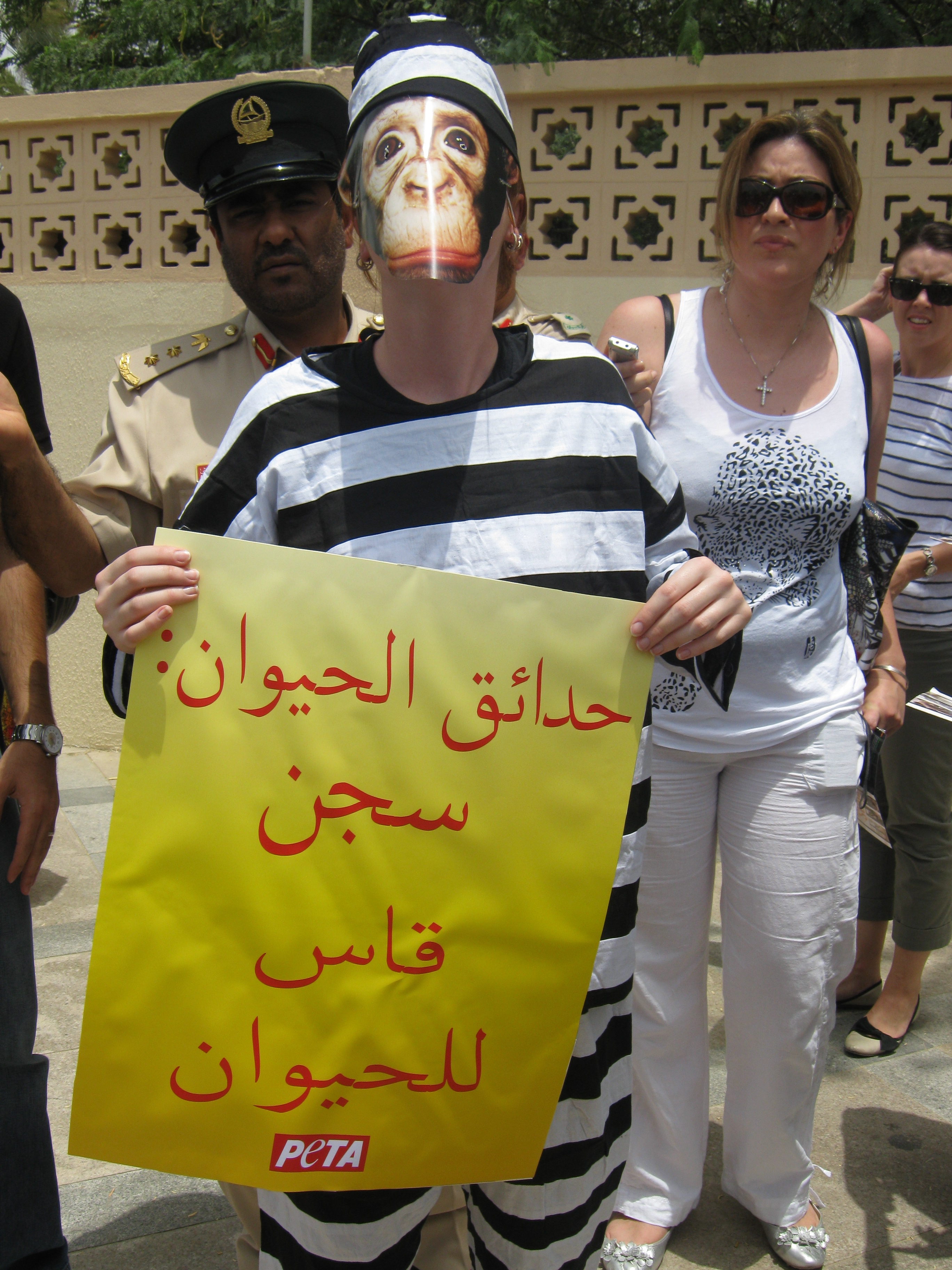Last year we had a pro-vegetarian lettuce lady demonstration in Jordan, before police broke up our peaceful protest and carted us to jail. The intent of our peaceful protest was simply to raise awareness that going vegetarian is the best thing you can do for your health, the environment, and the animals. We also had a KFC protest in downtown Cairo to urge the fast food chain to implement minimal animal welfare standards, where our PETA Asia director Jason Baker was attacked by a mob of KFC staff members and was arrested. We also protested Dubai Zoo for the abhorrent conditions in which their animals are kept – the police closed us down early too.