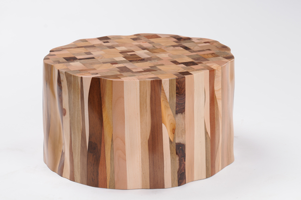 "upcycled wood stool design"The wooden stools that form the handcrafted pieces of The Wake collection are, in the words of the designers, “inspired by the wake ceremony” and by “the notion of anticipation for reincarnation.”  The designers have meticulously glued together various wooden scraps and then carved them into the shape of a tree trunk, in an attempt to reincarnate these wood chips back into their original form.