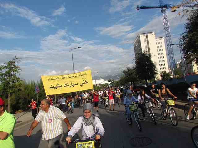 ‘Leave Your Car at Home!’ reads this banner above as Lebanese and internationals embark on a bike protest by occupying the road along the Meditarrean-bordering Corniche in Beirut that is ordinarily full of car traffic, mostly with just one person in each car.