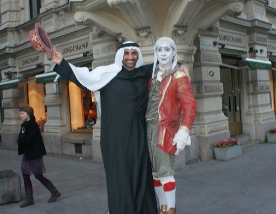 Green Prophet’s own Green Sheikh posing with a mime. Could the Caracas model of street miming reign in bad Middle East drivers?