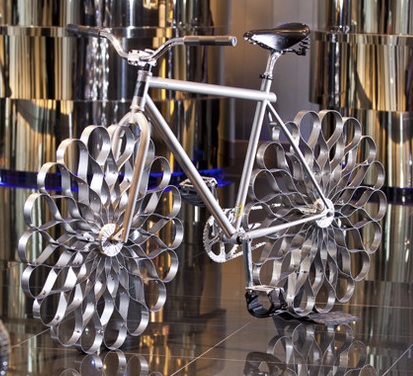 Designed as a type of flower, the wheels are each made of 18 steel strips that are pinned together at different tension points to create a circle.