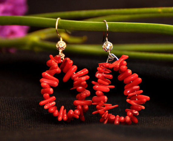 Red bamboo coral earrings made by Papercrane Studios, an Etsian Jordanian Team member.