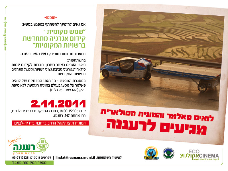One of these stops will be in the central town of Raanana, where Louis Palmer will give a brief lecture about his fossil fuel-less vehicle. Visitors will also have a chance to see the taxi up close.