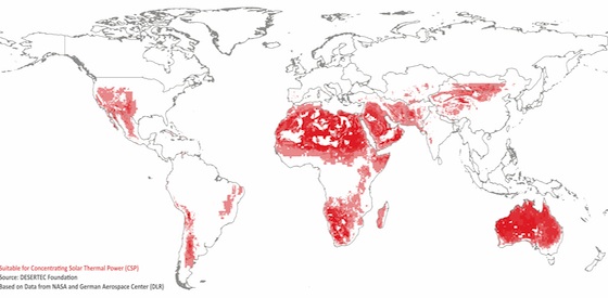TREC believed that the idea could be replicated worldwide, asĀ 90% of the worldās population lives within range of a desert and could be supplied with solar electricity from there. And alternatively, “TheĀ entire worldās electricity demand could be satisfied by a hypothetical concentrating solar power mirror field inĀ outback Australia 432 kilometres on a side,ā the originating scientists claimed.