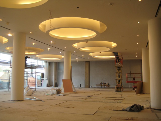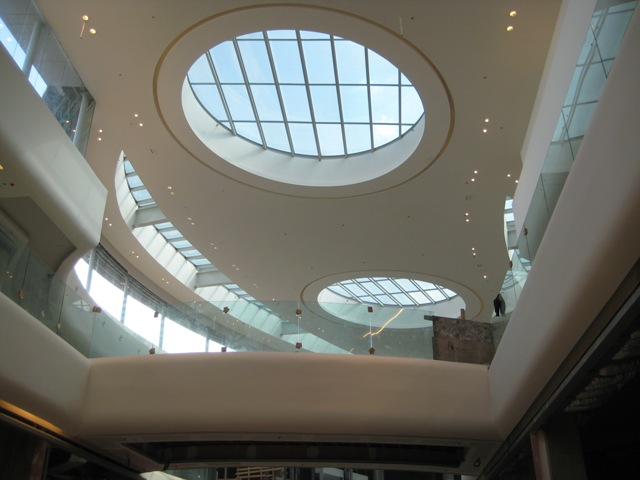 The 80,000 sq meter building, scheduled to open its mid March, 2012, is being built with special glass “sky lights” in the upper floors to let it utilize natural lighting during the daytime.