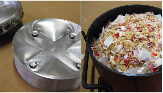 On their innovative work method, designers Adi Shpigel and Keren Tomer write that “a measured mixture of the two materials is pressed into an aluminum mold and then baked. The heat creates a homogeneous connection without using any adhesives.”