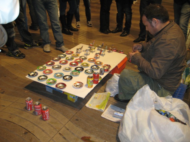 On the city’s famous La Rambla pedestrian promenade several people were selling art works made from recycled items, including beer and soft drink cans, and even magnetic tape cartridges.