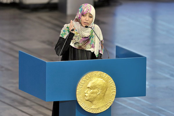 Tawakkol Karman, a Yemeni journalist and political activist instrumental in the Arab Spring is the youngest peace prize laureate to accept the prize in a ceremony over the weekend. She is one of three women including Leymah Gbowee and Ellen Johnson Sirleaf to accept the prize this year, and according to reports, the first Arab woman to be honored.