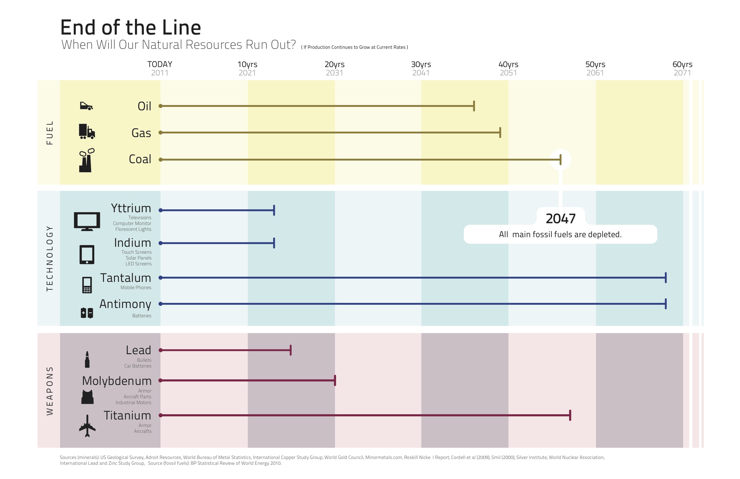 This eye-opening video raised a lot of questions about how feasibly we can continue on our so called developmental path full of fancy gadgets and cloud-hugging towers when we live on a planet of finite resources. But convincing people to think about this is tricky – until you see a nifty infographic like the one put together by American designer Camden Asay and posted on FastCo Design. Finally, thanks to one succint (but no doubt fallible) chart, we have a pretty good idea of just how quickly we are depleting … a lot.