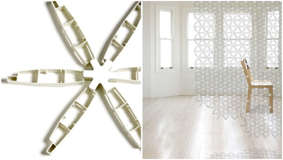 One of the designs in the ‘Tris Collection’ – the divider curtain pictured above – plays on the context of the source material. Plastic pieces that once served as window shutters are now being transformed into curtains, another type of sun-blocking (albeit less opaque) device.
