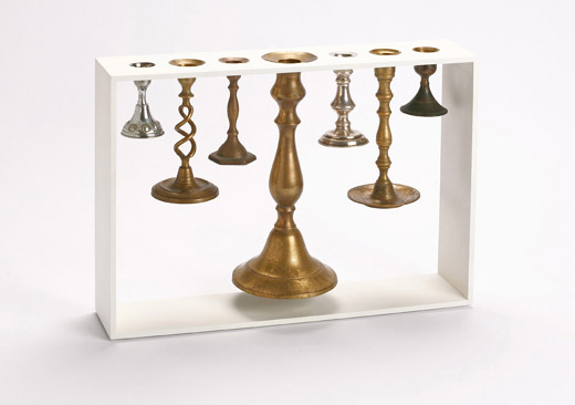 Repurposing multiple solitary candlesticks that had lost their mates, the menorah above made by Reddish Studio renders the candlesticks functional as part of an ensemble again. While this version only has 7 candlesticks, it could be easily expanded and adapted to suit the requirements of a Hannukah menorah.