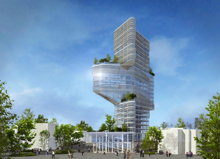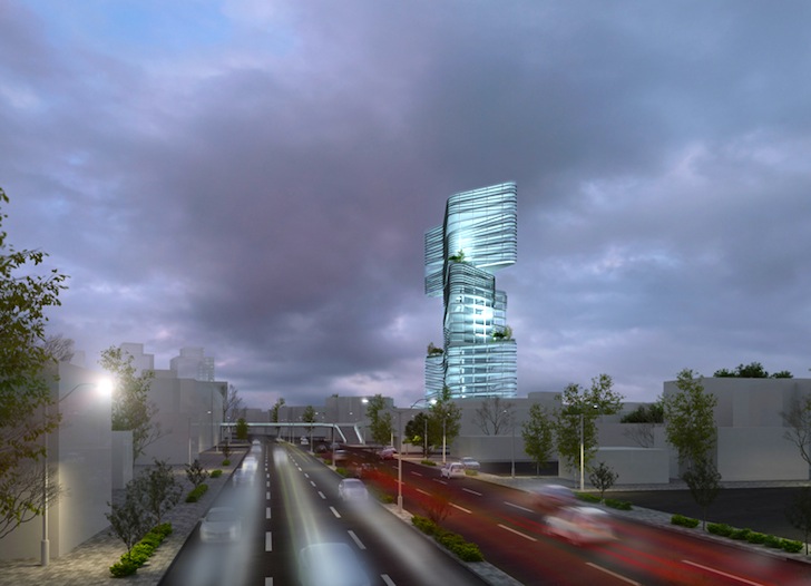 We have a real soft spot for earth architecture, such as Nader Khalili’s gorgeous domes and arches fit for space, and these amazing Syrian beehive-shaped buildings that have lasted hundreds of years, but we also acknowledge the great strides that contemporary Israeli architects have taken to realize modern buildings more sustainable than their antecedents. In addition to the LEED Platinum-hopeful Porter School of Environmental Studies at Tel Aviv University, Netanya’s new City Hall is one of them. By giving this twisting tower a light frame with a mashrabiya-type screen, Yaniv Pardo has considerably reduced the required building materials and energy footprint. More pictures and sketches of this proposed structure below.