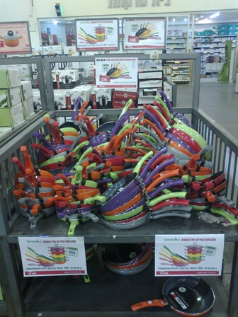 Kolbotek caused panic among Israeli consumers when the show pointed out that some of the ceramic cookware brands, such as Neoflam, contain high amounts of poisonous metals such as lead and cadmium. While the jury is still out on the effects of the pans, stores are slashing the prices to get rid of potentially defective and dangerous cookware. Maurice’s images above and below, show us so.