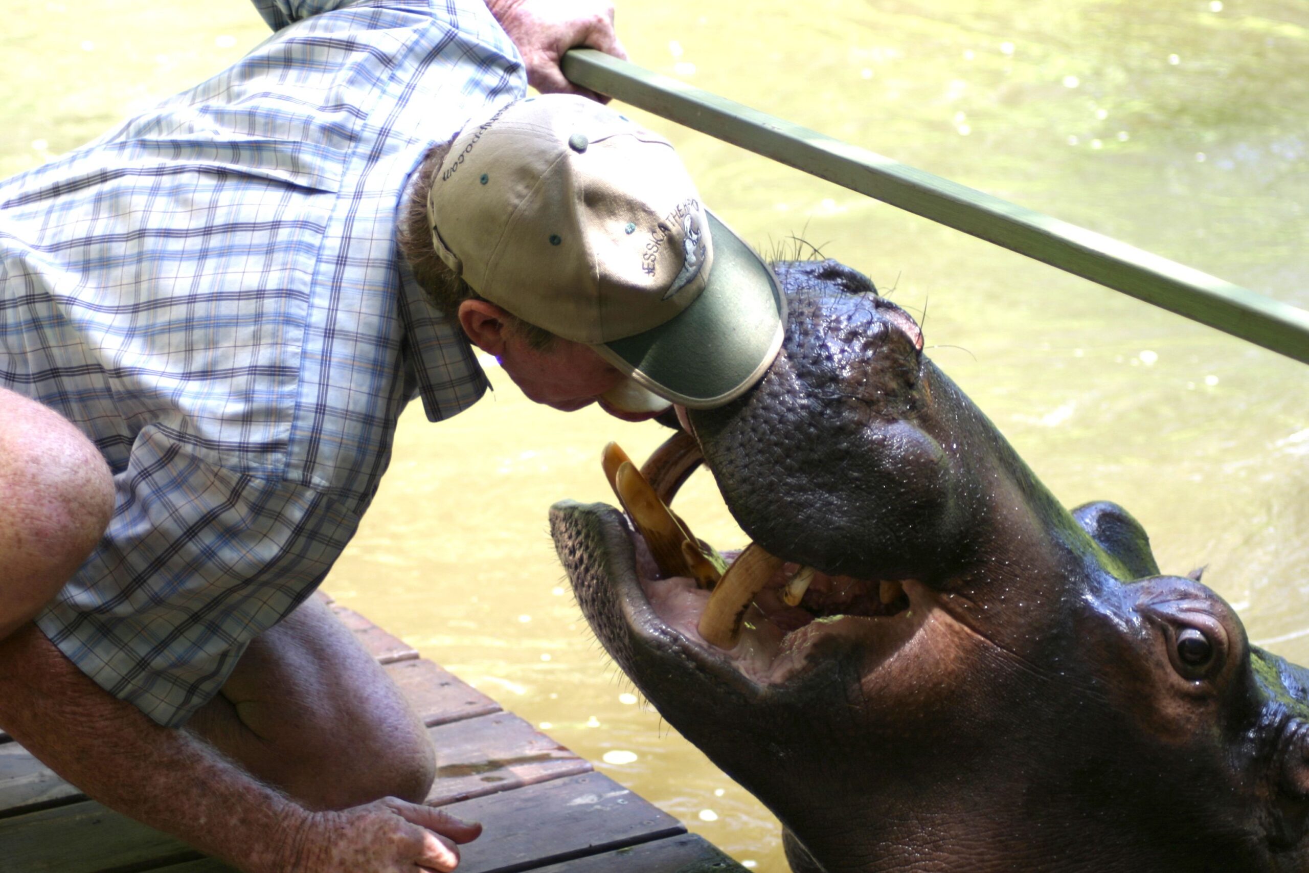 Having grown up to fear hippos more than any other creature on the African continent, it was with great hesitation that I approached Jessica’s giant canine teeth and powerful gaping jaw. Just seconds before, Tonie Joubert planted a kiss on the smiling hippo, who washed up on his doorstep in South Africa 12 years ago after devastating floods separated her from her mother.