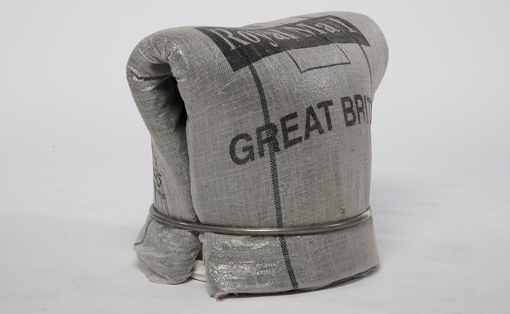 The Royal Stool is made of a British Royal Mall bag that is draped over a plastic bucket and secured with a ring that holds it in place. Alternatively, the bag could be placed over any other type of found object to turn it into a stool.