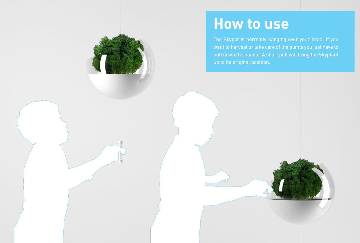 German designer Manuel Dreesmann has come up with Skyfarm, a hanging garden design intended for balconies that places plants high enough so that you can still make use of your outdoor space in other ways. To access the plants, simply pull on the handle attached to each pot (as shown above).
